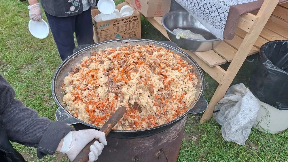 полевая кухня, где всех угощали ароматным пловом, создавая ощущение домашнего